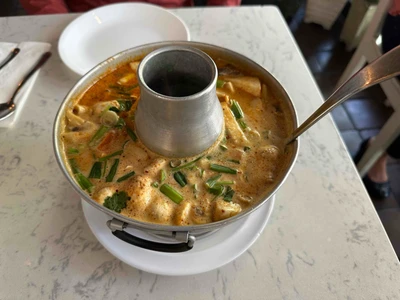 Soft tofu, tomatoes, mushrooms, onions, scallions, and cilantro in a tom yum paste, lime juice flavored with lemongrass, lime leaf, galanga, and chili paste.