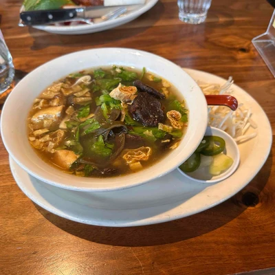 Tamarind, tomato, rice noodle, tofu puffs, lemongrass tofu, roasted vegetables, green onion, and bean sprout. Contains soy. Can be made soy-free on request.