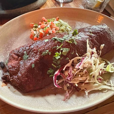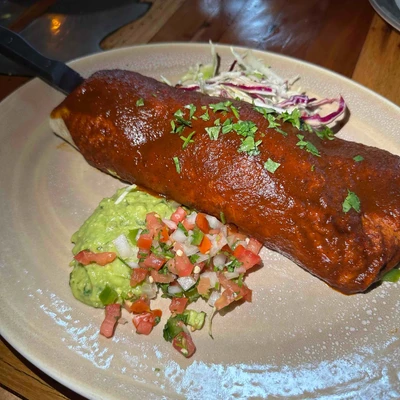 Flour tortilla filled with Mexican black beans, rice, Jack cheese, and cheddar cheese. Served with sides of serrano slaw, pico de gallo, guacamole, cilantro-lime sour cream, and garlic crema.