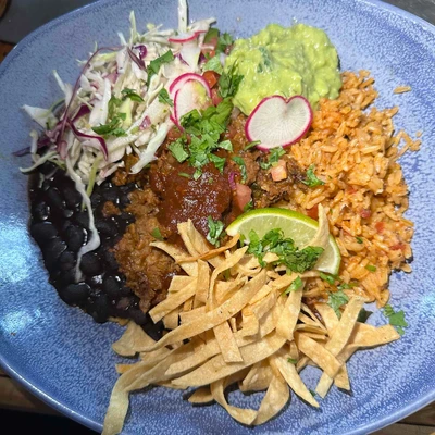Mexican black beans and rice, cheese blend, serrano slaw, pico de gallo, guacamole, radish, and tortilla strips. Choice of roja, verde, habanero, or poblano crema. Option to add braised chicken, carnitas, chorizo, ground beef, Southwest veg, or Beyond Picadillo.