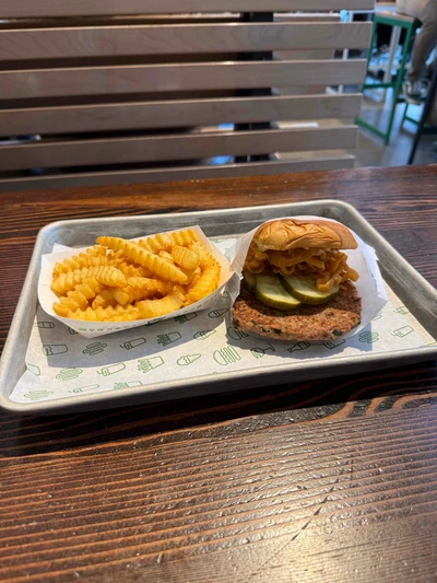 Love the veggie patty. You have to sub the bun for the gluten free version and I didn’t realize the crispy onions aren’t vegan until after I took this pic. You also have to remove cheese and shack sauce