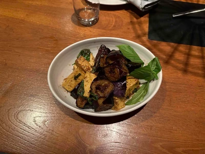 Fried tofu, eggplant, soy sauce, kafir lime leaf, and basil.