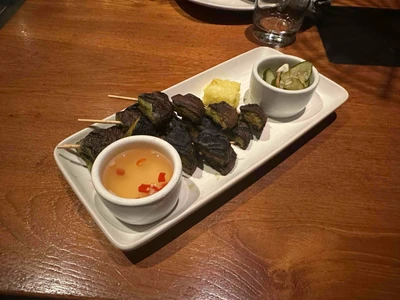 Four skewers. Fresh local shiitake mushrooms are marinated in coriander, garlic, and spices. Served with a chili vinegar dipping sauce.